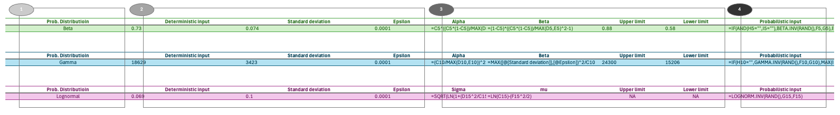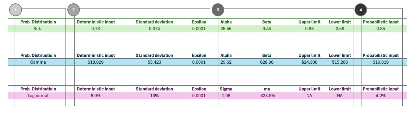- The model automatically calculates the required distribution parameters (e.g., Alpha, Beta, Mu, Sigma) using built-in formulas.