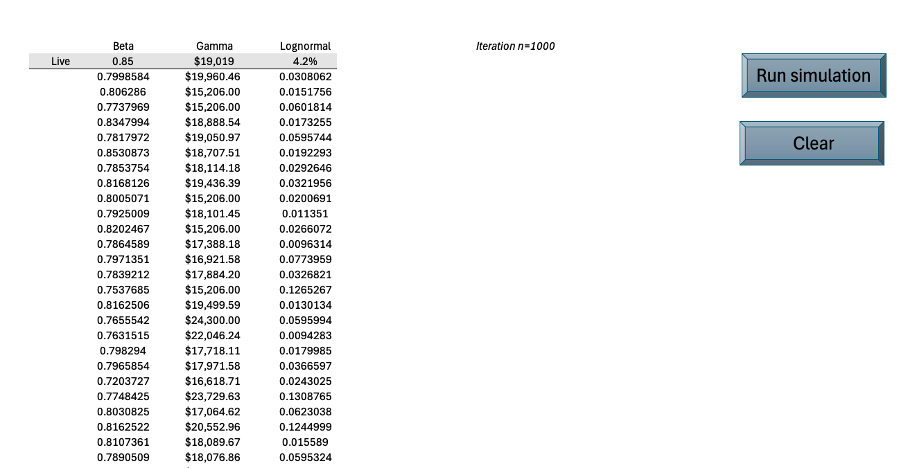 Briefly, the Live row displays probability outputs for the current iteration (referencing the previous sheet), while the rows below it store results from all 1,000 iterations. Two user-friendly buttons on the right allow users to run or clear the backend VBA simulations.